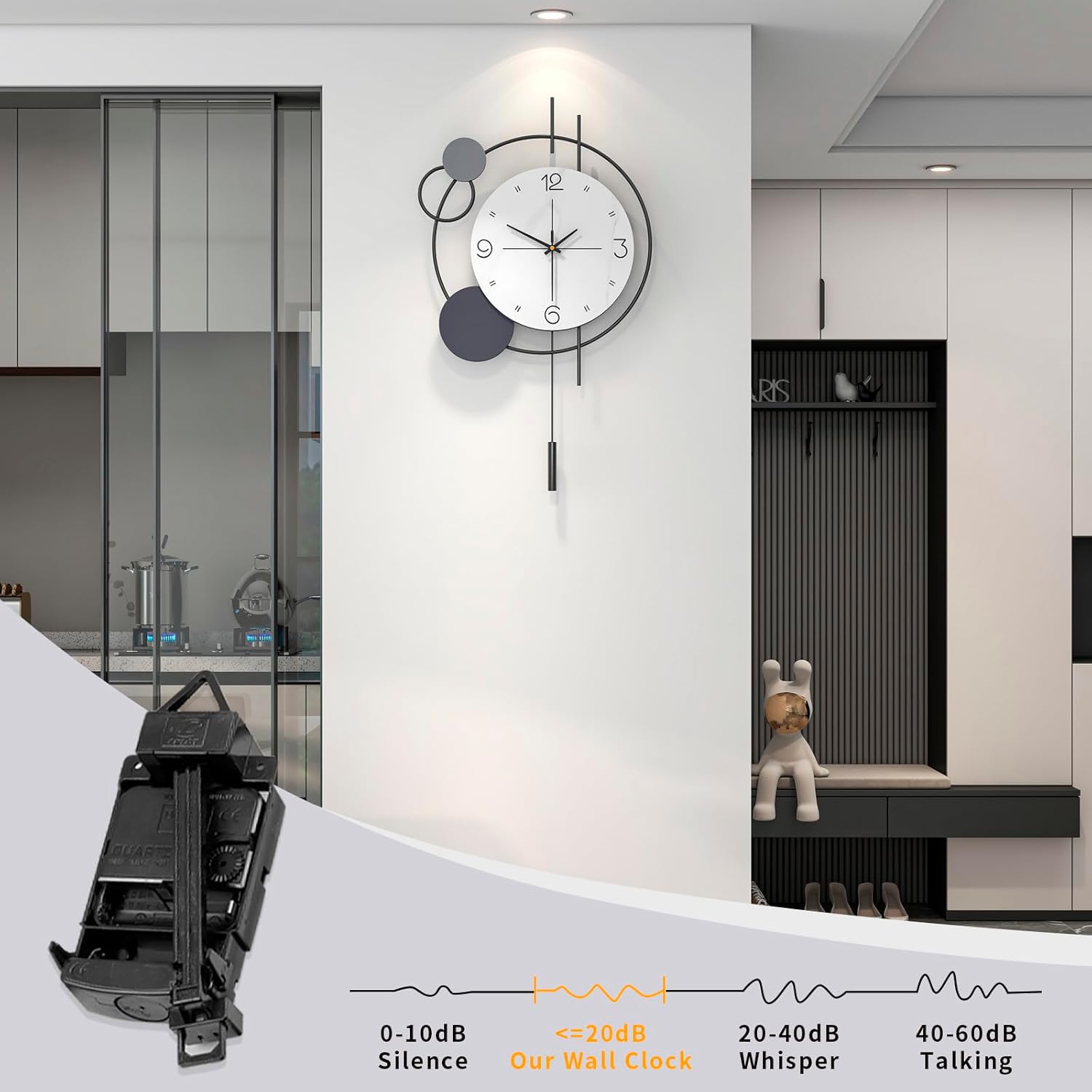 JTWALCLOCK Decorative Wall Clock for Living Room Decor Large Modern Black Metal Wall Clock with Pendulum Battery Operated Non Ticking 15 Inch Big Silent Clock for Kitchen Office Bedroom Home Decor
