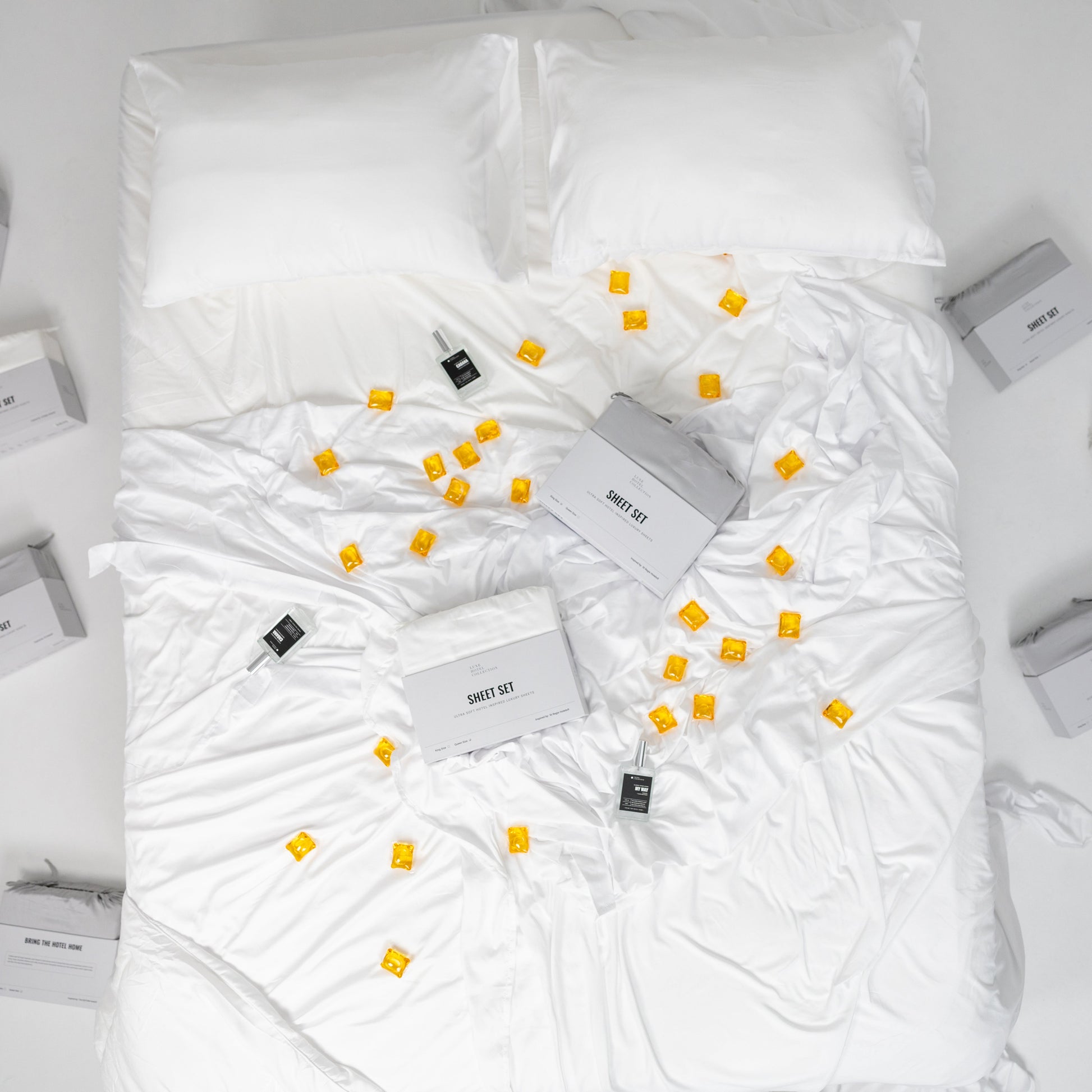 Includes (1) Fitted Sheet, (1) Flat Sheet, (2) Pillowcases, and a complimentary 30-pack Laundry Pods (My Way) and Room Spray (My Way).