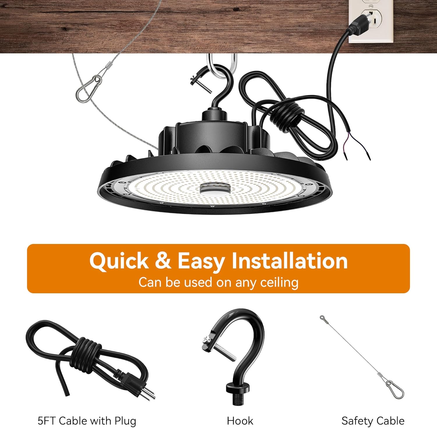 Unlike others’ 40cm power cord, this LED high bay light features a standard US plug with 5FT super long power cord which keeps you away of wiring and frustrating of power cord length insufficient issue.